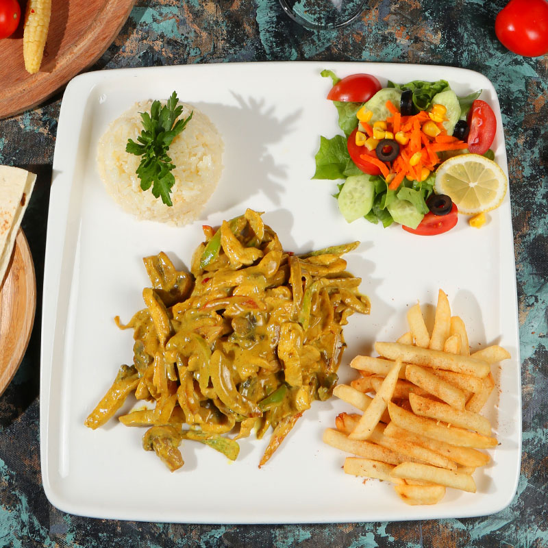 Jülyen Doğranmış Tavuk, Köri Sos, Mantar, Yeşil Biber, Kapya Biber, Soğan, Krema Sos, Patates Kızartması, Mevsim Sebzeleri ve Pilav Eşliğinde