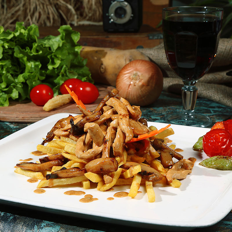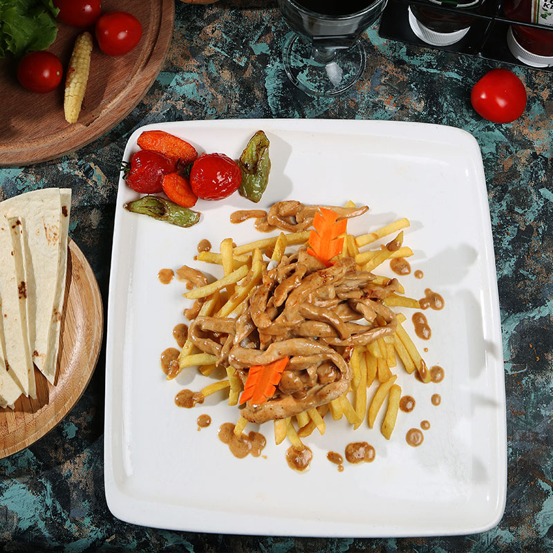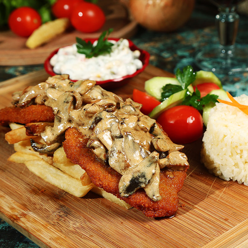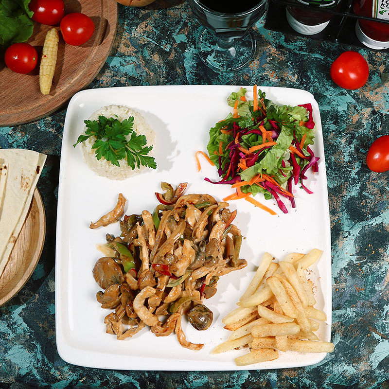 Jülyen Doğranmış Tavuk, Soya Sos, Mantar, Yeşil Biber, Kapya Biber, Soğan, Krema, Patates Kızartması, Mevsim Sebzeleri ve Pilav Eşliğinde